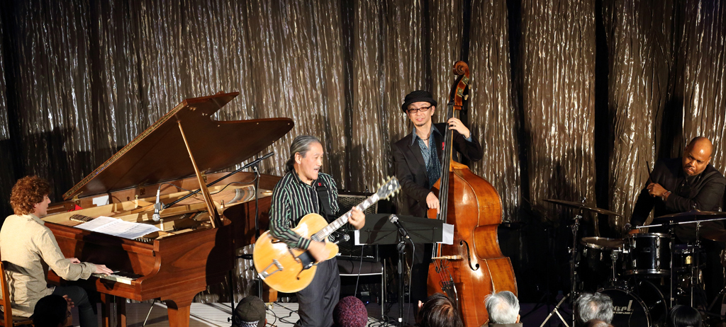 長い在米歴に裏打ちされた実力派で、米ジャズ人名事典に名が載る数少ない日本人である笹島明夫(ギター)さんが、H.ハンコックと9年プレーしたジーン・ジャクソン(ドラム)さん、ヨーロッパで大活躍するドイツ出身の新星バナ・ギーリグ(ピアノ)さんをニューヨークから引連れ来日し、小倉・山口を代表するベーシスト小車洋行さんとカルテットを結成。川棚公演が実現しました。