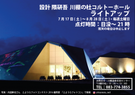 三角形を組み合せた多面体の不思議なカタチの建物、川棚の杜・コルトーホール。世界的建築家・隈研吾氏設計の建造物を灯りとプロジェクションアートでライトアップします。