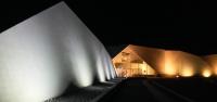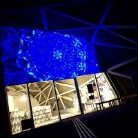 川棚温泉のど真ん中に建つ川棚の杜コルトーホールは、三角形を組み合せた多面体の不思議なカタチの建物。その設計は、東京オリンピックスタジアムを手がける建築家隈研吾氏によるもの。期間中は建物のライトアップと山頭火俳句や万華鏡アートの投影。